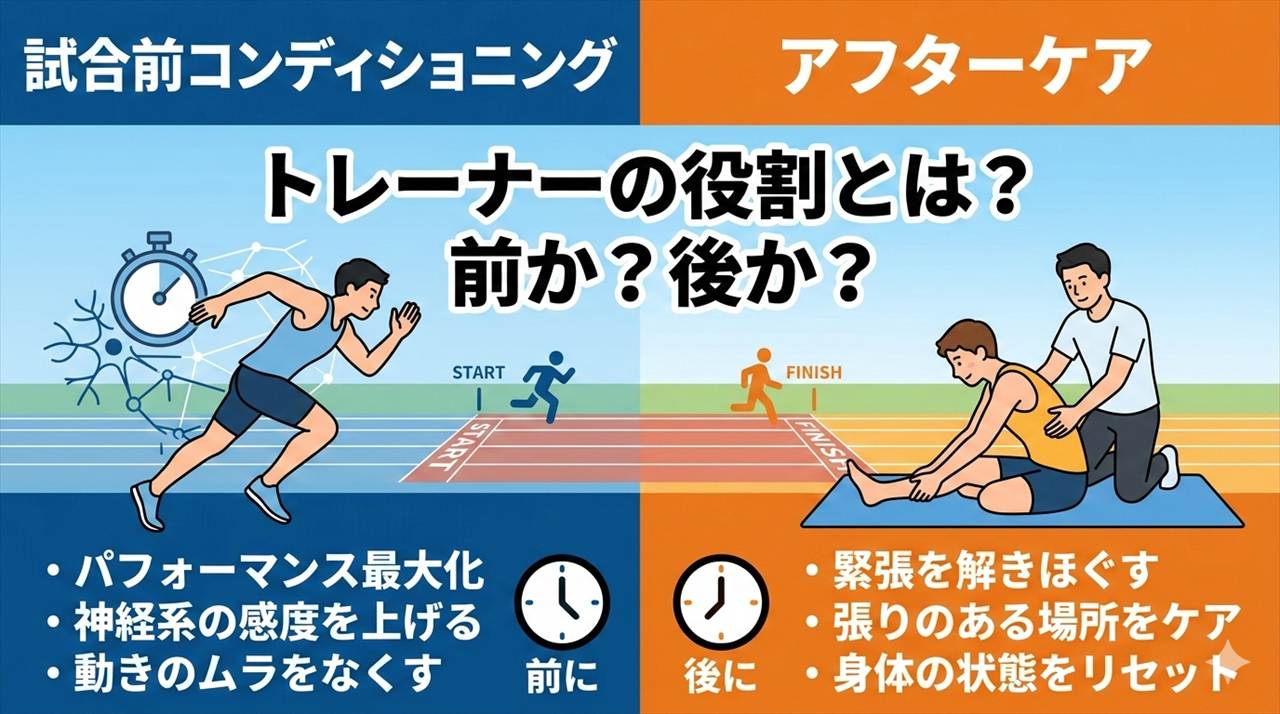 ここで言うコンディショニングとは、試合前に身体の状態を整えてパフォーマンスを最大化するための調整のことです。