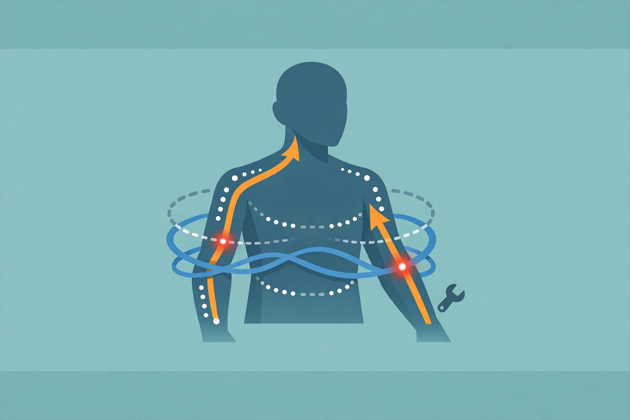 治療の現場では、どの筋肉が硬いか、どこが弱いかという「場所の特定」に力が注がれることが多くあります。それ自体は間違いではありません。ただ、場所を特定して施術しても、なぜそこが焼き切れたのかという問いには答えていません。同じ負荷パターンが続く限り、別の場所でまた起きます。